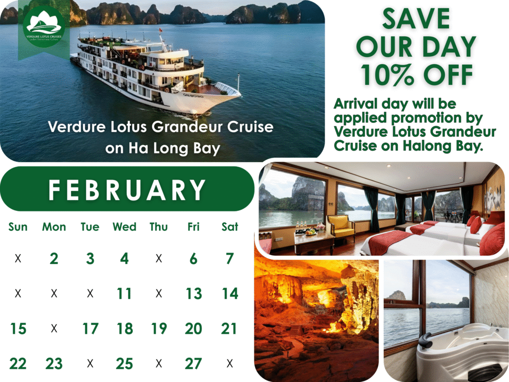 Experience the pinnacle of luxury on Halong Bay with Verdure Lotus Grandeur. This February, we are inviting you to trade the ordinary for the extraordinary with an exclusive booking incentive.