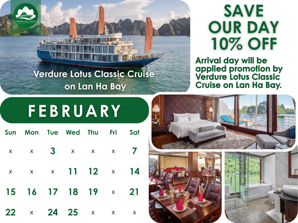 Escape the crowds and find your zen in the tranquil waters of Lan Ha Bay. This February, Verdure Lotus Classic Cruise invites you to enjoy a premium boutique experience at an unbeatable price.